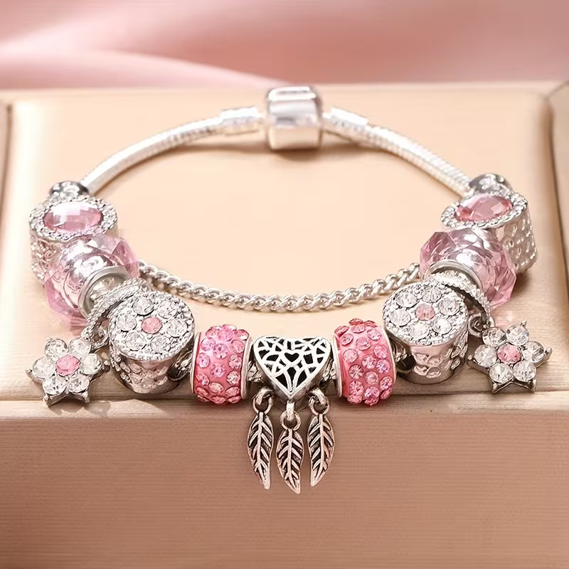 Heart and Leaf Charms with Sparkling Rhinestone Heart Pendant, Resin Cut-Out Large Beads, and Snake Bone Chain
