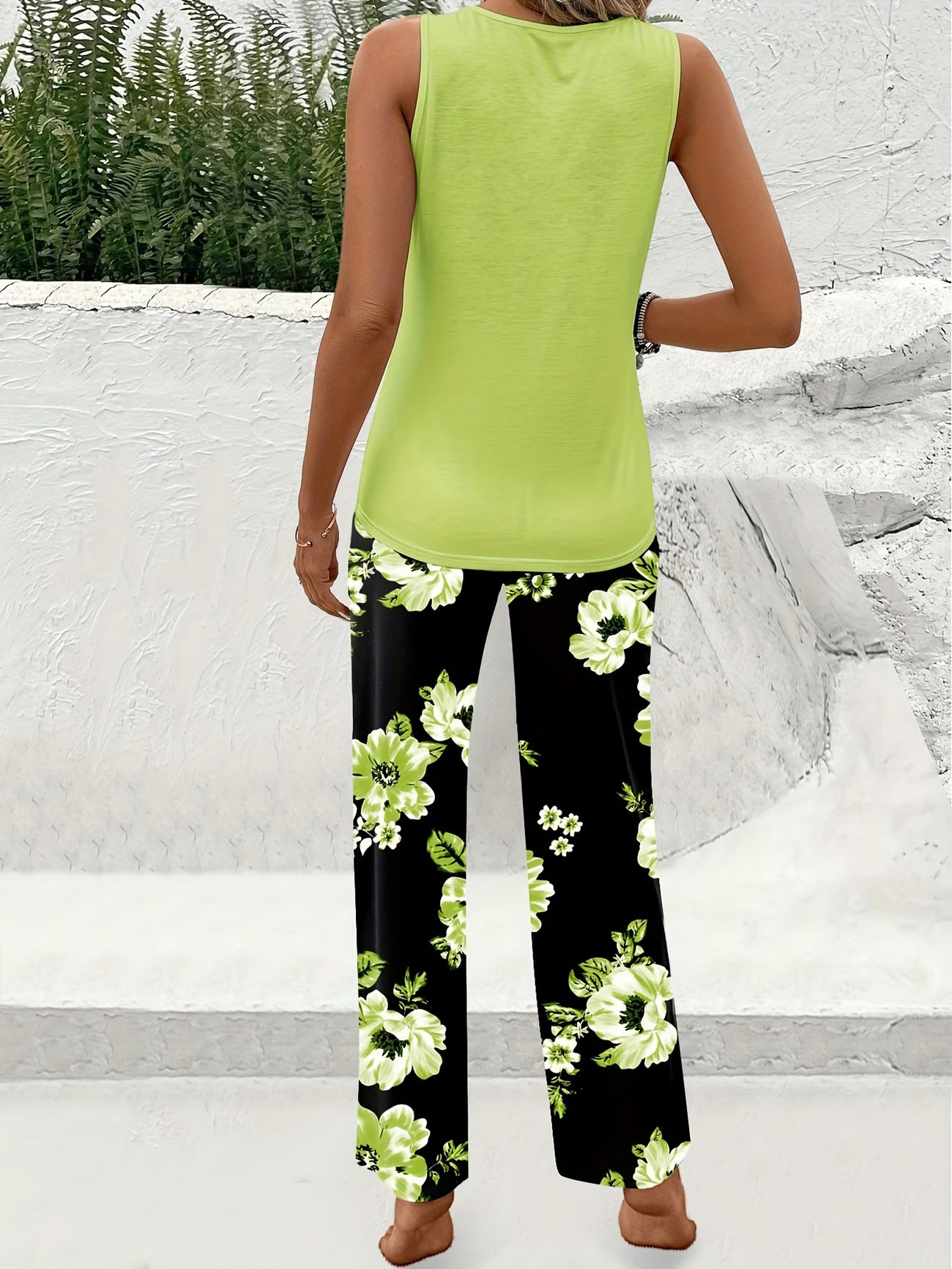 Floral Print Long Pants Sleeveless Top Vest Sleepwear Set