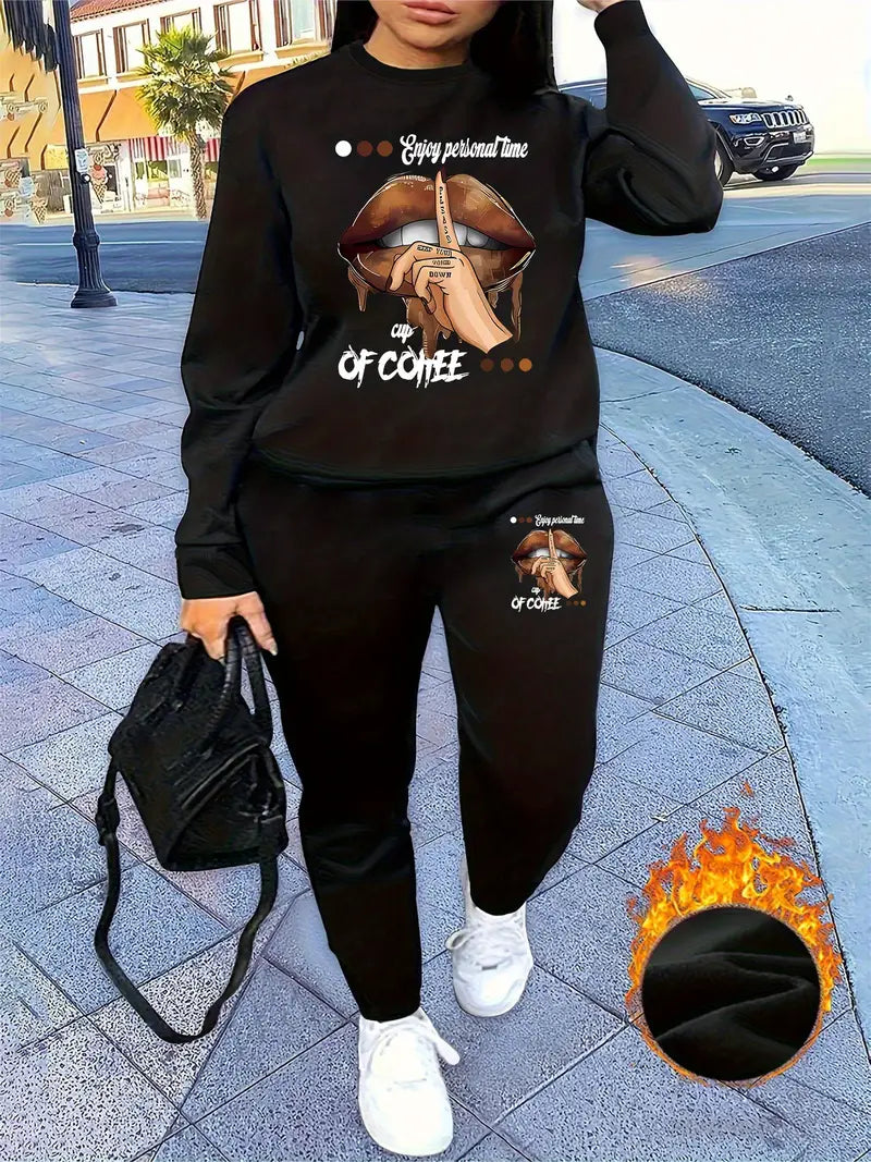 , Casual Long-Sleeve Fleece Sweatshirt with Jogger Pants Elegant Outfit,