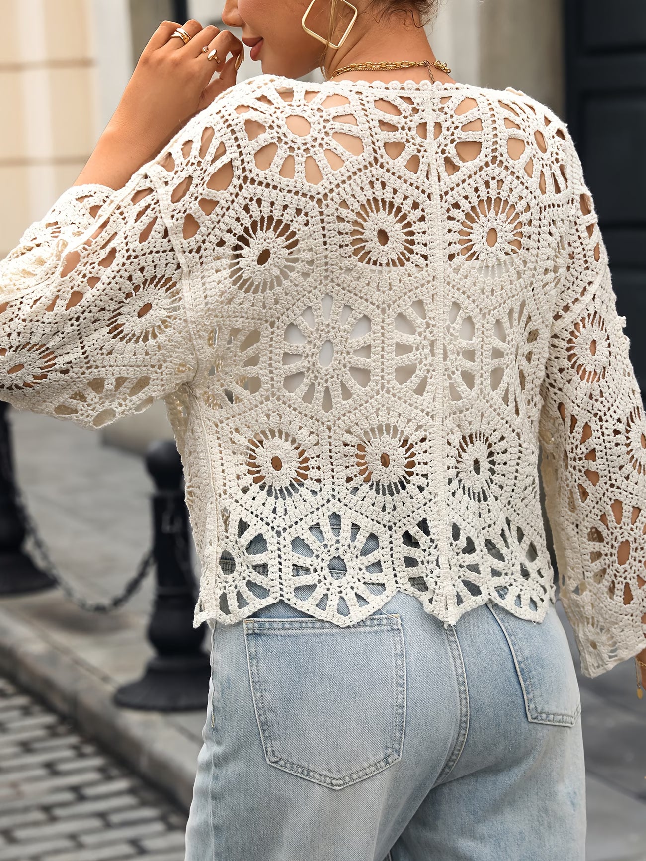 Hollow-Out Lace Oversized Women's Cover-Up Round Neck Cardigan