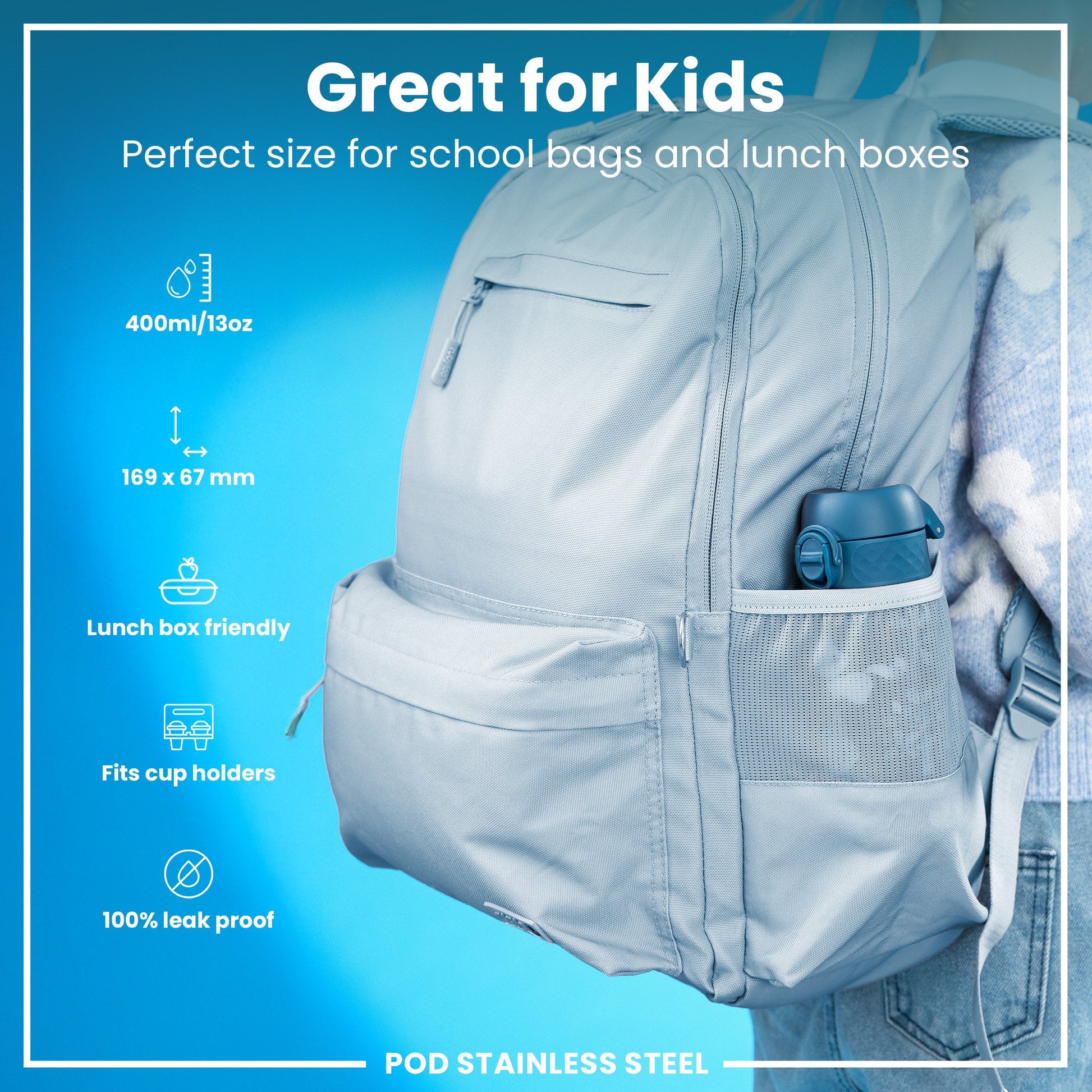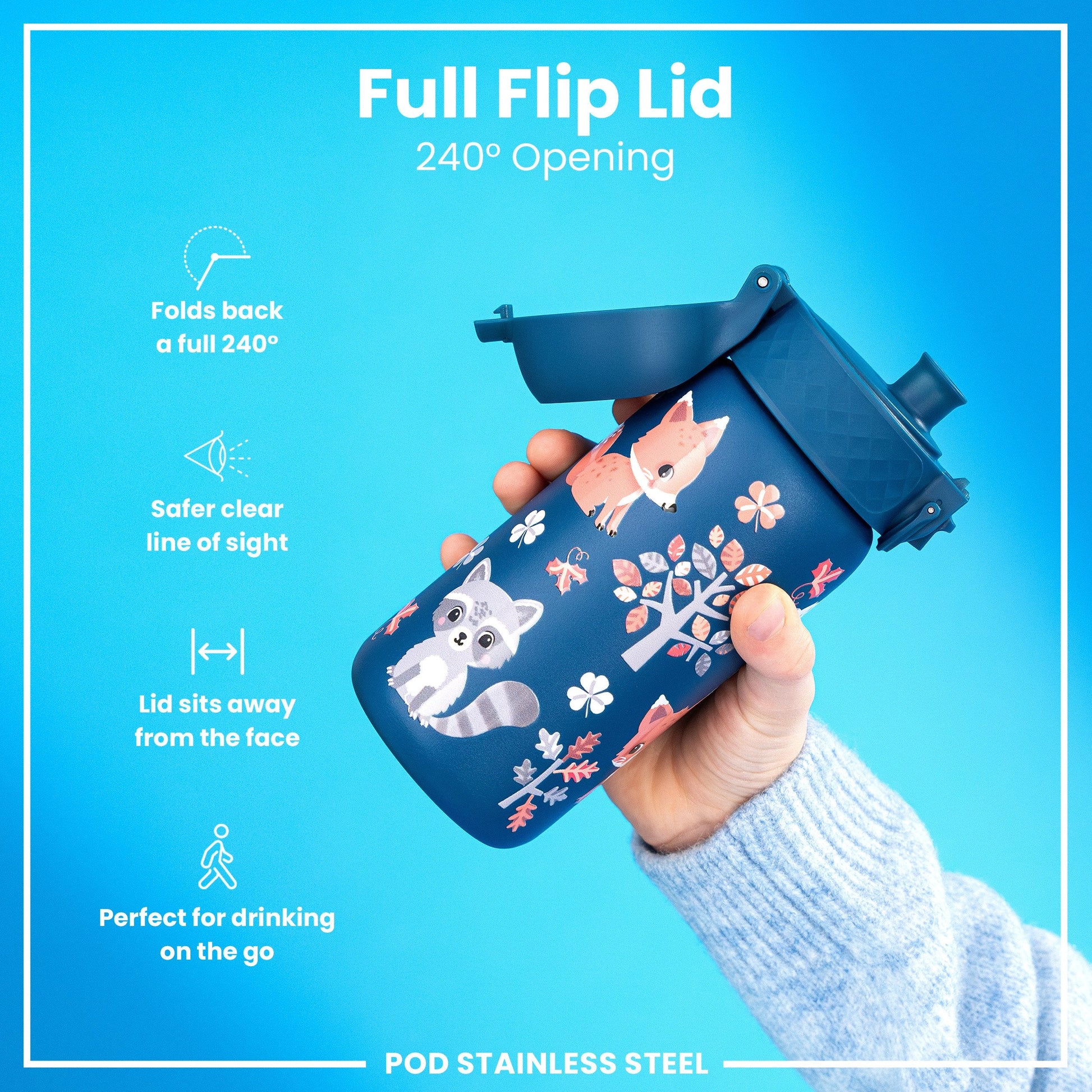 100% leak proof 400ml / 13oz stainless steel water bottles with a smooth flow for spill-free hydration and hygienic full-flip top cover for one handed use on-the-go.