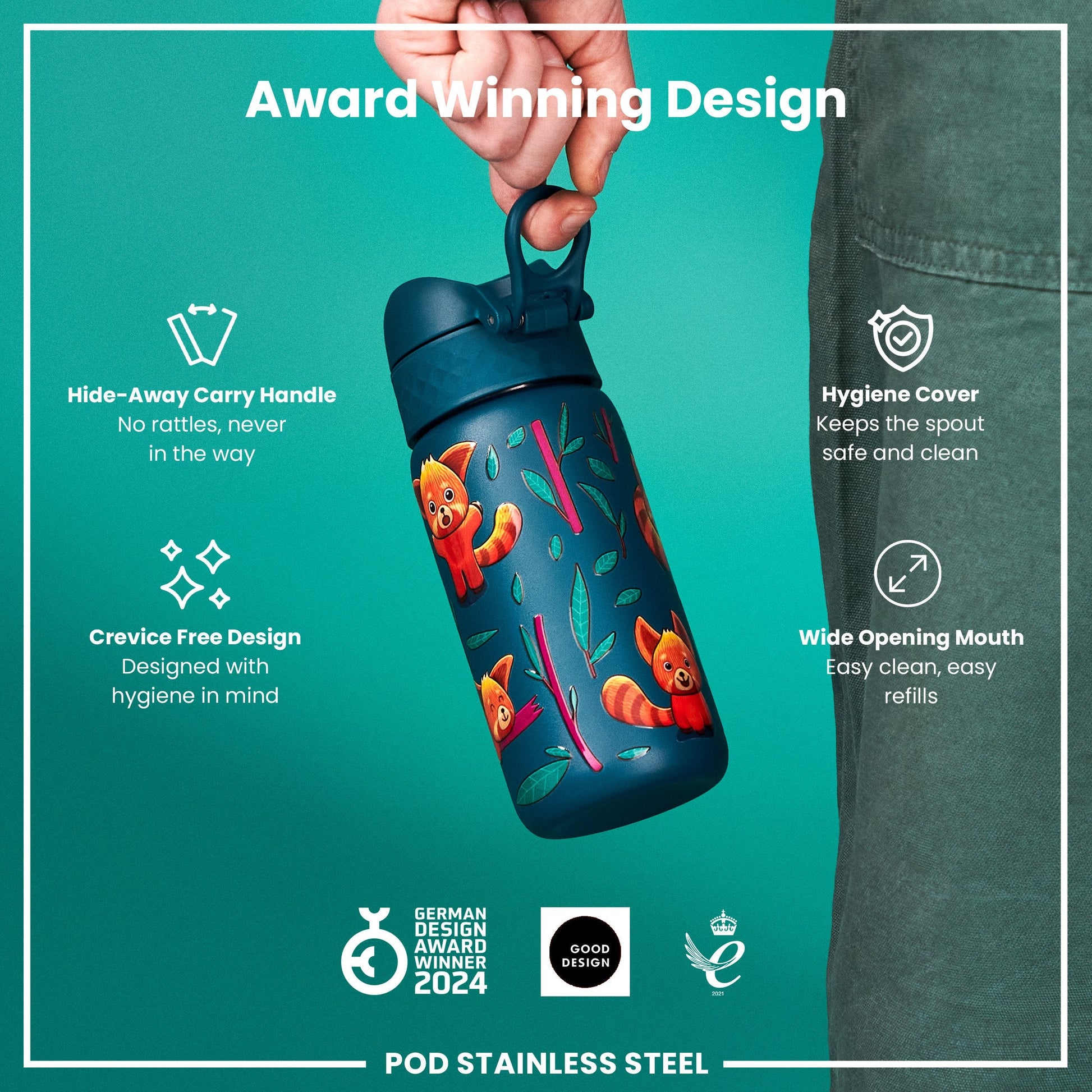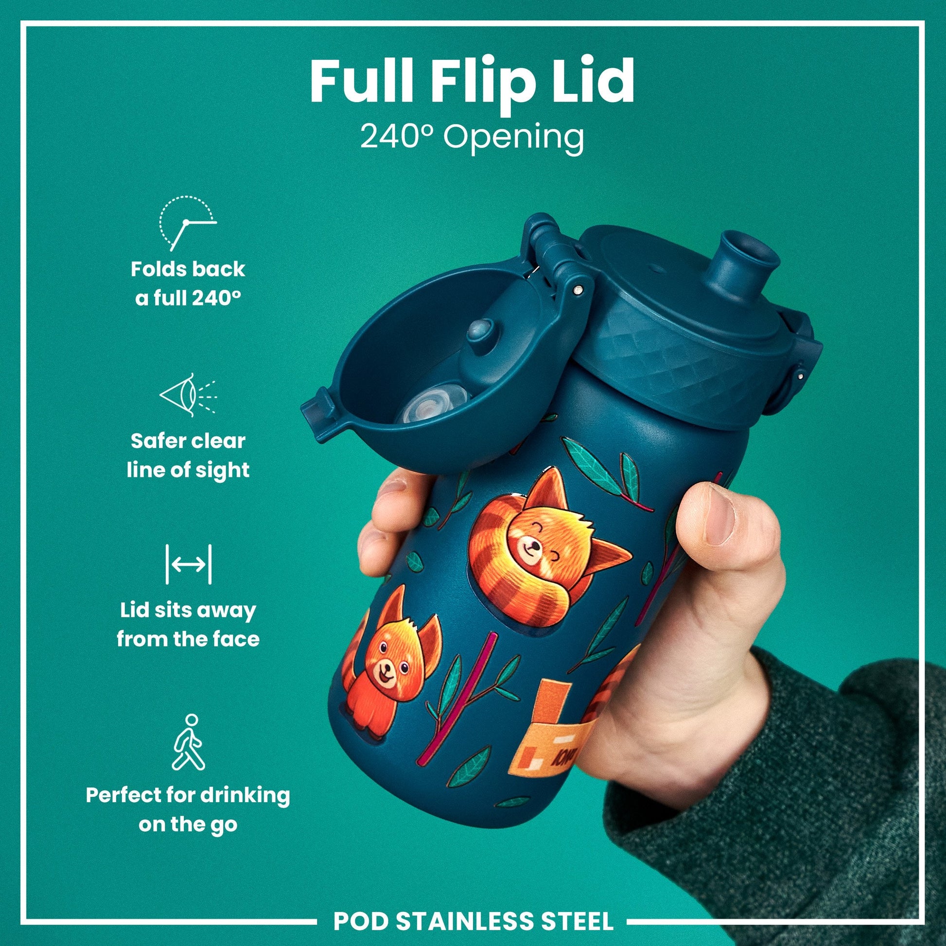 Leak Proof Kids Water Bottle, Stainless Steel, Red Pandas, 400ml (13oz)