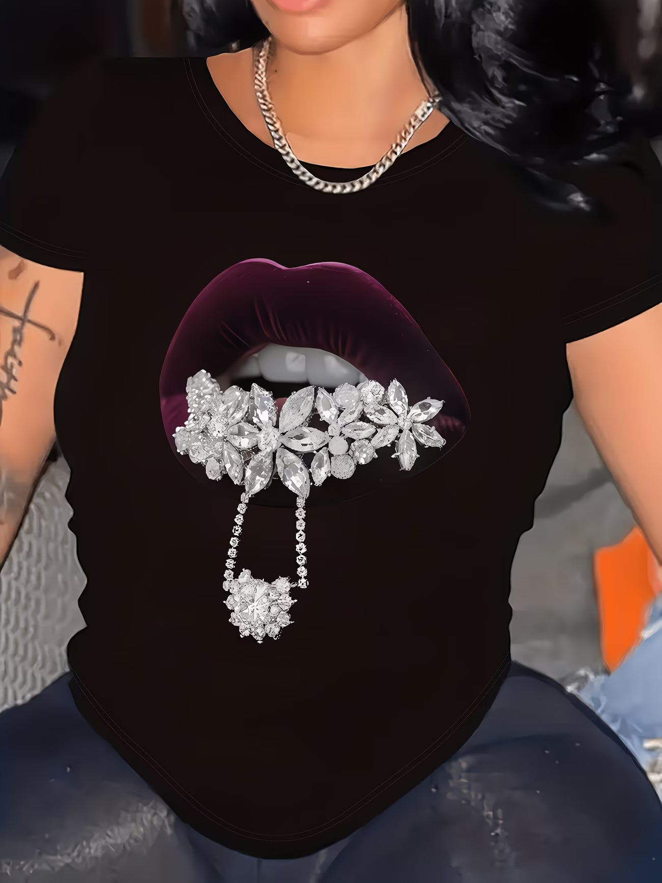 Pair this sassy tee with leather trousers or a faux leather skirt for an edgy night-out look, or keep it casual with distressed jeans and ankle boots. Layer under a blazer for a fun twist on smart-casual, or wear it solo to let the bold lip print take centre stage.