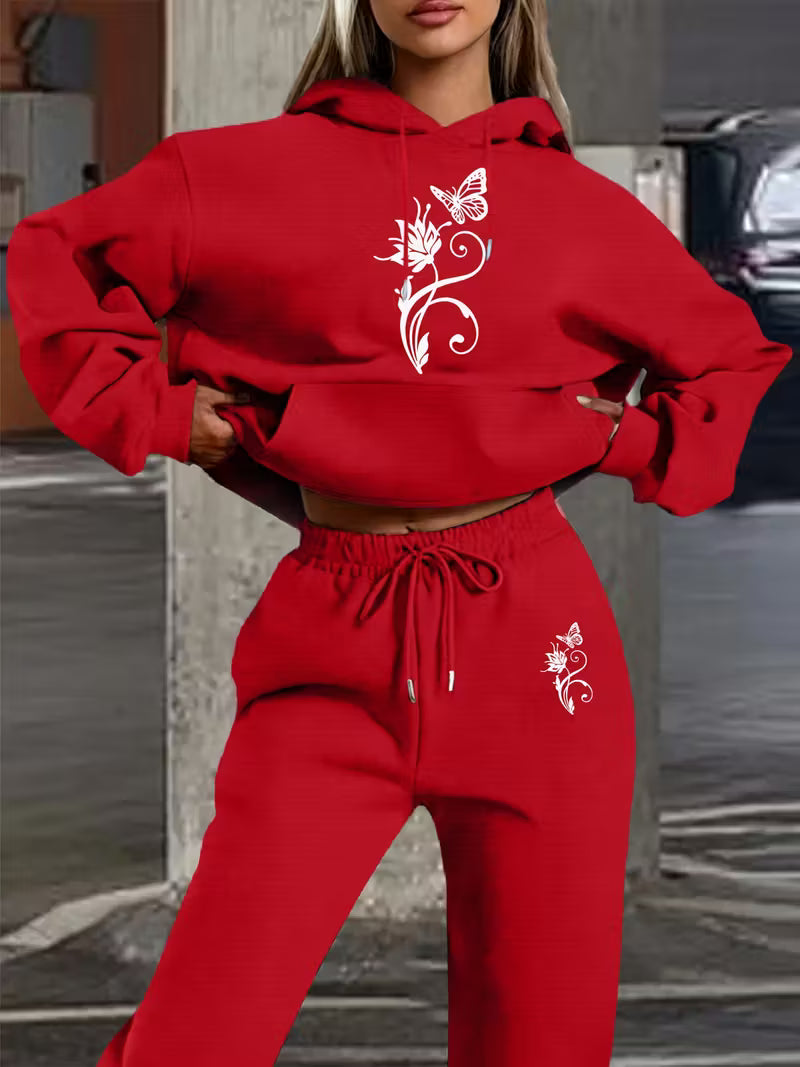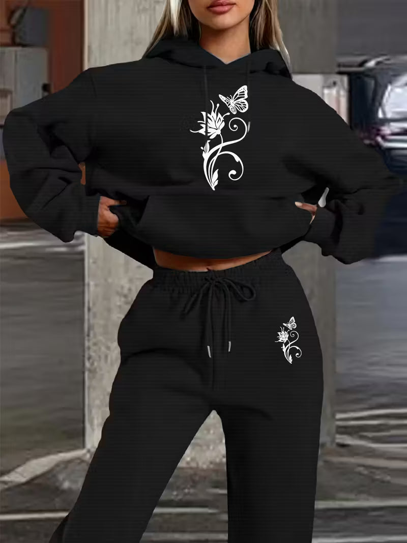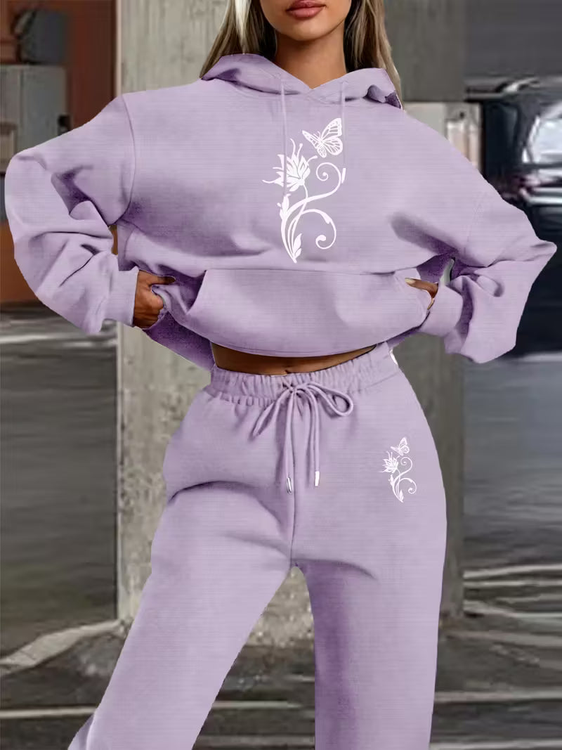 Casual Letter Print Loose Warm Long Sleeve Hooded Drawstring Waist Pants Two-Piece, Butterfly