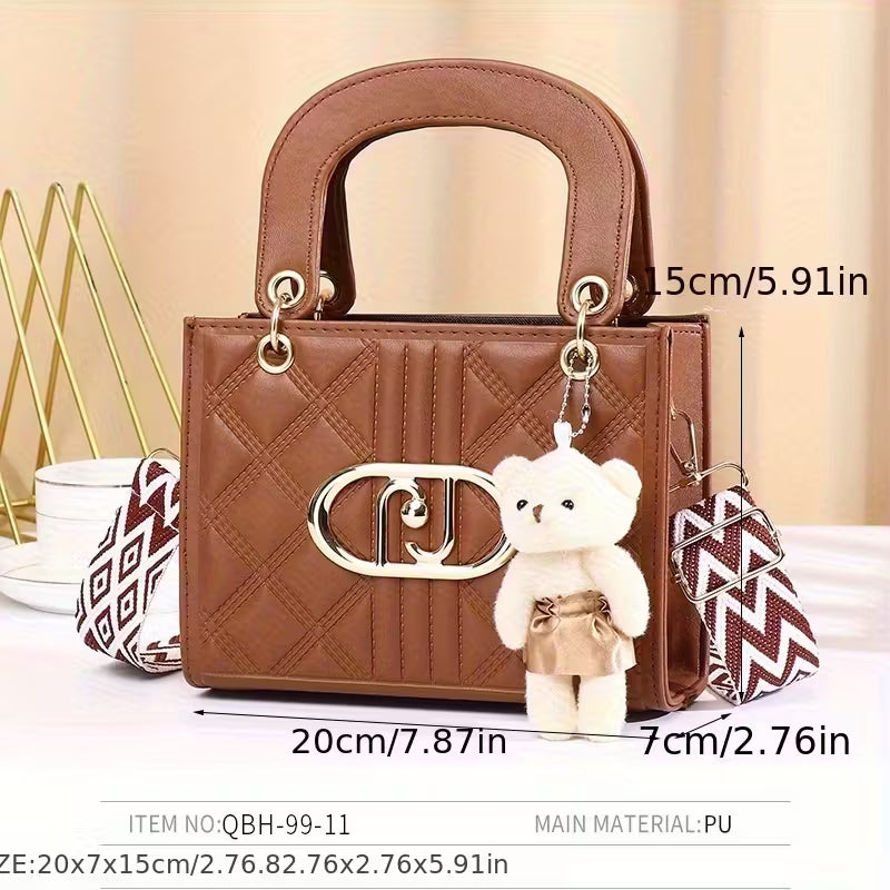 -Embellished handbag with Detachable Shoulder Strap & Bear Charm - Small Square Purse in 6 Colors (Deep Brown, Pink, Purple, Red, Blue, Black)