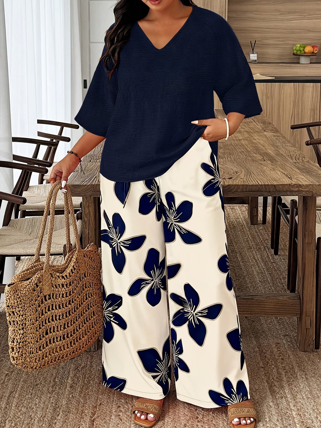 A sophisticated co-ord pairing a ¾ sleeve top in a tactile craft-effect fabric with flowing long pants in a bold random print with contrast trim detailing. Effortlessly polished across our curve range.