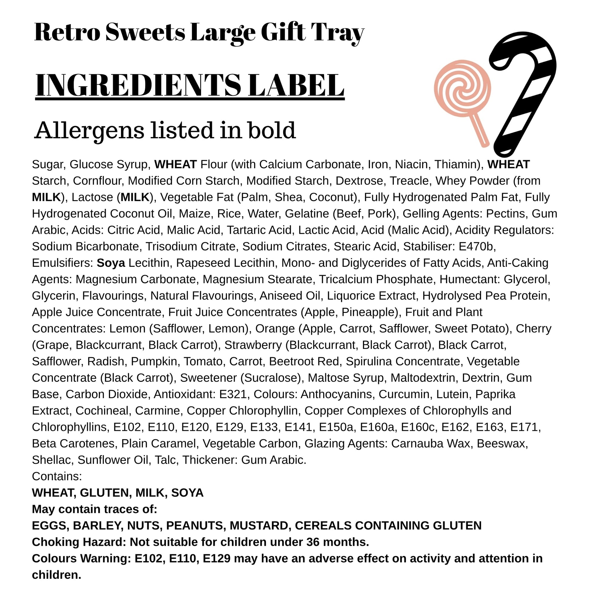 Sugar, Glucose Syrup, WHEAT Flour (with Calcium Carbonate, Iron, Niacin, Thiamin), WHEAT Starch, Cornflour, Modified Corn Starch, Modified Starch, Dextrose, Treacle, Whey Powder (from MILK), Lactose (MILK), Vegetable Fat (Palm, Shea, Coconut), Fully Hydrogenated Palm Fat, Fully Hydrogenated Coconut Oil, Maize, Rice, Water, Gelatine (Beef, Pork), Gelling Agents: Pectins, Gum Arabic, Acids: Citric Acid, Malic Acid, Tartaric Acid, Lactic Acid, Acid (Malic Acid), Acidity Regulators: Sodium Bicarbonate, Trisodium Citrate, Sodium Citrates, Stearic Acid, Stabiliser: E470b, Emulsifiers: Soya Lecithin, Rapeseed Lecithin, Mono- and Diglycerides of Fatty Acids, Anti-Caking Agents: Magnesium Carbonate, Magnesium Stearate, Tricalcium Phosphate, Humectant: Glycerol, Glycerin, Flavourings, Natural Flavourings, Aniseed Oil, Liquorice Extract, Hydrolysed Pea Protein, Apple Juice Concentrate, Fruit Juice Concentrates (Apple, Pineapple), Fruit and Plant Concentrates: Lemon (Safflower, Lemon), Orange (Apple, Carrot, Safflower, Sweet Potato), Cherry (Grape, Blackcurrant, Black Carrot), Strawberry (Blackcurrant, Black Carrot), Black Carrot, Safflower, Radish, Pumpkin, Tomato, Carrot, Beetroot Red, Spirulina Concentrate, Vegetable Concentrate (Black Carrot), Sweetener (Sucralose), Maltose Syrup, Maltodextrin, Dextrin, Gum Base, Carbon Dioxide, Antioxidant: E321, Colours: Anthocyanins, Curcumin, Lutein, Paprika Extract, Cochineal, Carmine, Copper Chlorophyllin, Copper Complexes of Chlorophylls and Chlorophyllins, E102, E110, E120, E129, E133, E141, E150a, E160a, E160c, E162, E163, E171, Beta Carotenes, Plain Caramel, Vegetable Carbon, Glazing Agents: Carnauba Wax, Beeswax, Shellac, Sunflower Oil, Talc, Thickener: Gum Arabic.