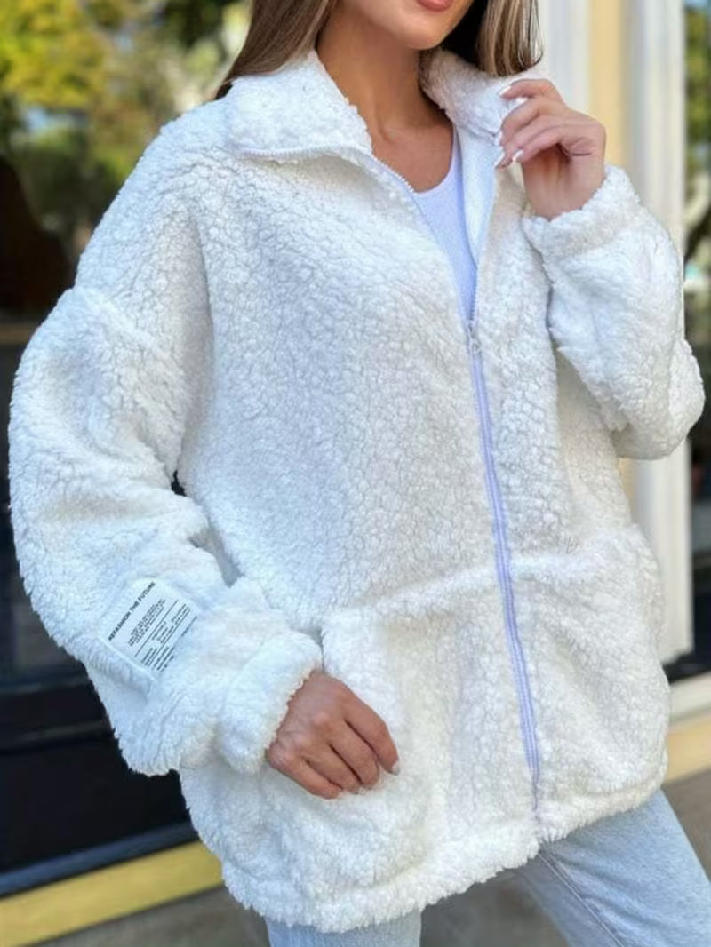 Winter Warm Open-Front Zipper Front, Soft Textured Cozy Casual Outerwear with Buttoned Cuffs & Collar, Solid Color