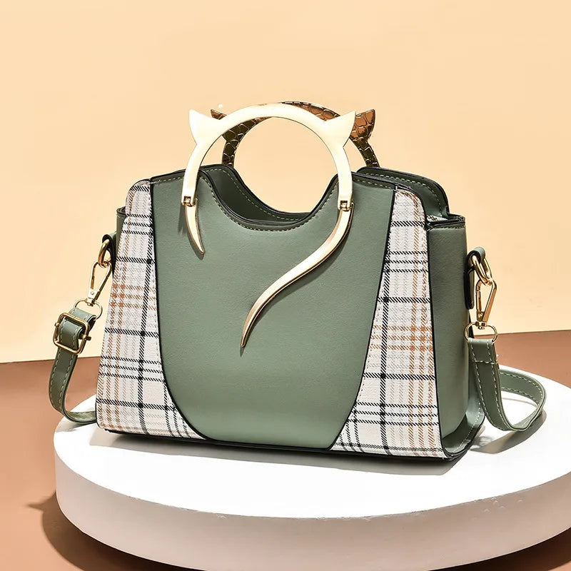 Women's Pu Leather Splicing Plaid Classic Style Sewing Thread Bucket Zipper Handbag